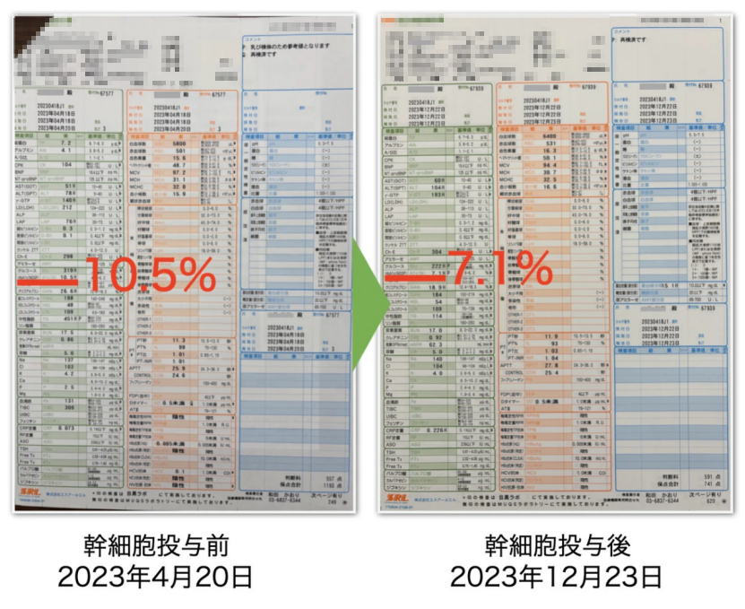 首次进行 2 亿干细胞的输注后,很快 HbA1c 就降至 5.4% ,血糖也降到 90,完全大幅改善至正常数值。从 2024 年 1 月起,逐渐减少胰岛素的使用量,到同年 3 月时,已进展到每 3 天注射 1 次,向摆脱胰岛素不断迈进。以不依赖胰岛素等药物治疗、凭借自身干细胞的力量实现根治为目标的 Y.S (女士),其目标正逐步达成 。